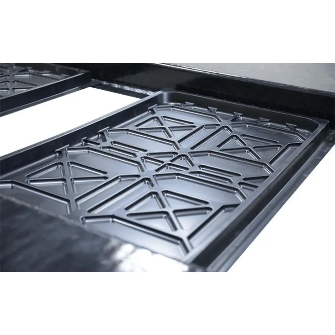 Standard accessories include four quick-mount casters, lightweight-yet-tough polyethylene drip trays, a mobile jack tray (wide and sturdy enough to hold bottle jacks of varying sizes and profiles) and lightweight, easily removable aluminum approach ramps. Yep, that means one price, one selection and a helluva lot of you-get-it-all. To top it off, GrandPrix keeps your vehicles safely contained at all times with forward and rear-mounted hardened steel tire stops.