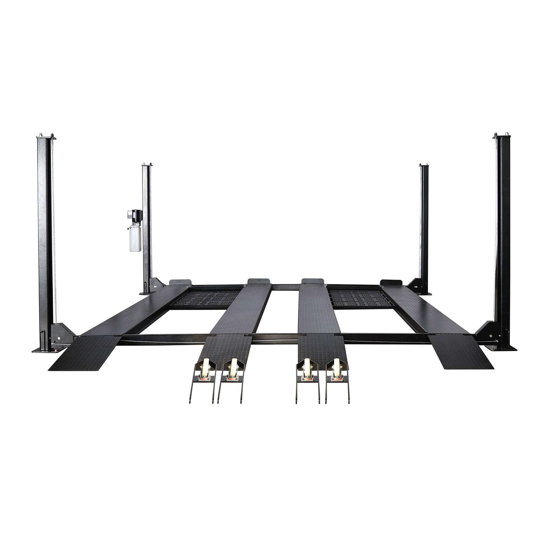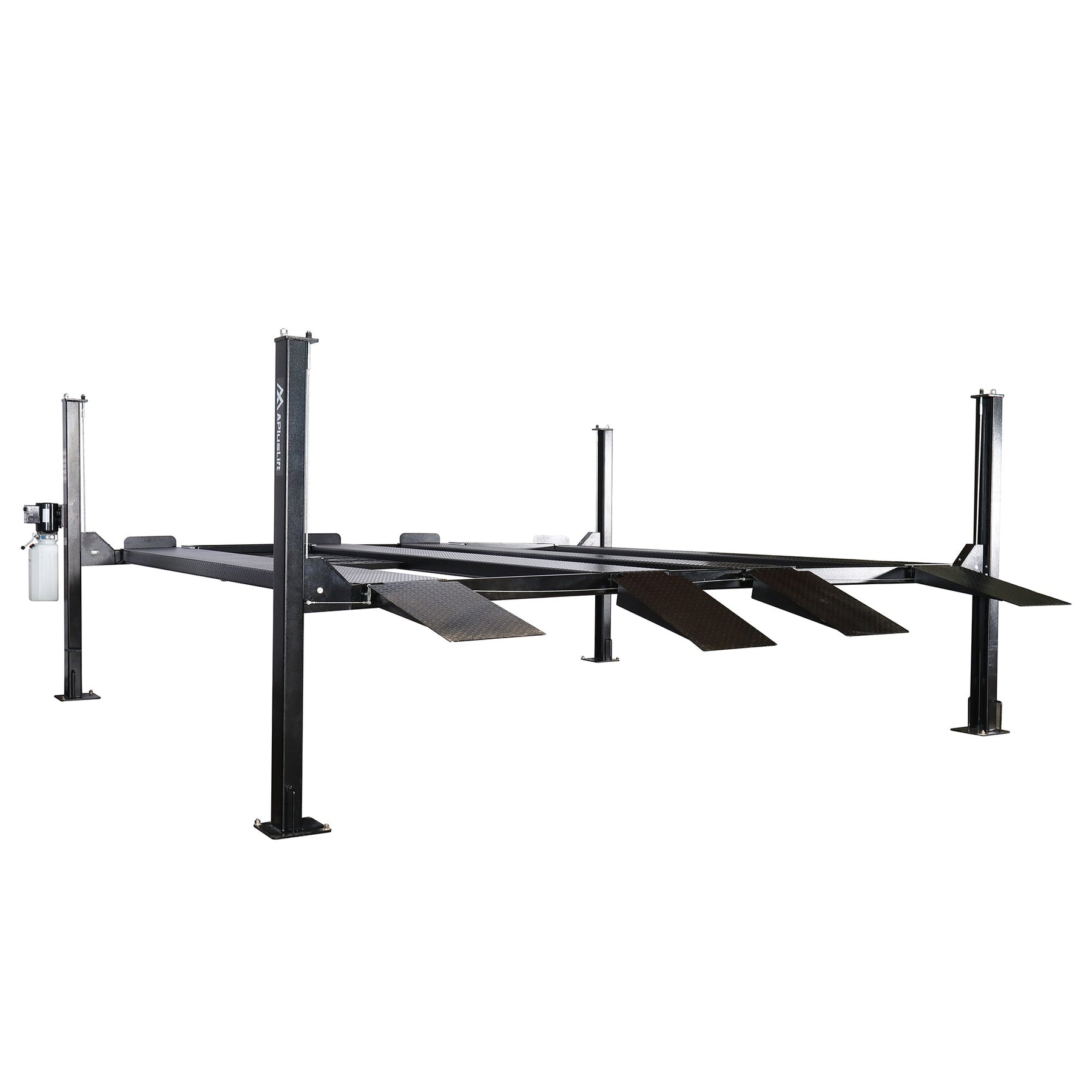 APlusLift HW-9KDP 4-Post Lift includes 2 decks, 4 runways, a caster kit, 2 jack trays, 6 drip trays, and 4 removable approach ramps.