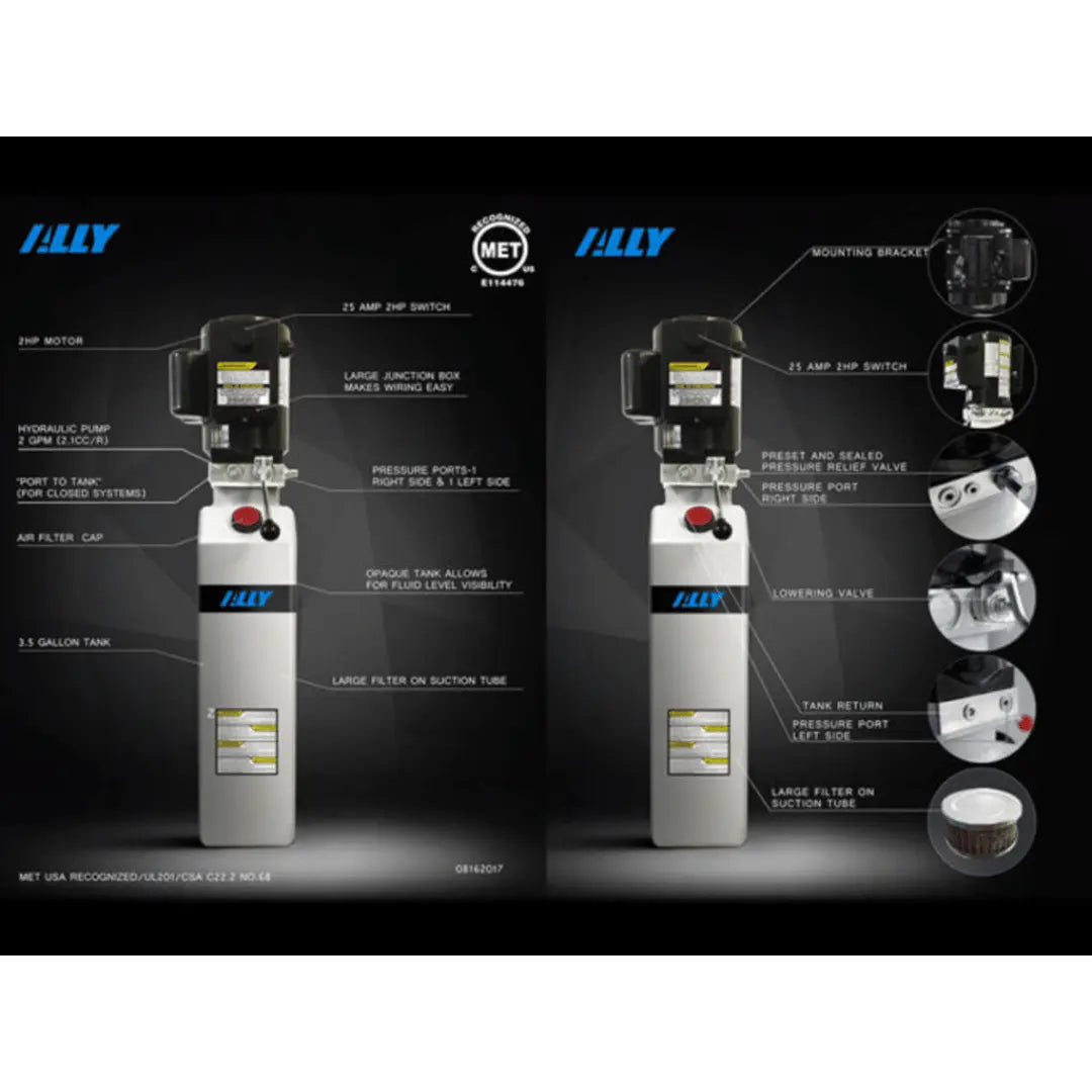 This product features an ALLY Hydraulic AL2650 power unit. This premium power unit is certified by MET Laboratories Inc. for electrical compliance in the United States and Canada. Extra heavy-duty armatures and more motor windings with increased silver metal included in the wires and connections create far less heat generation and allow ALLY Hydraulic power units to maintain constant torque through the lifting process. This power unit also carries an industry leading two-year limited warranty.