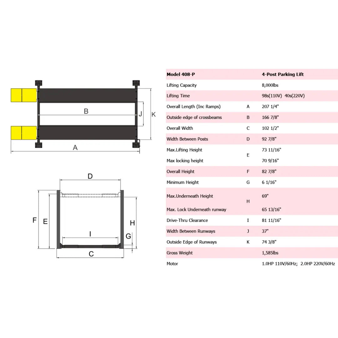 Equipped with either a 1.0HP motor for 110V/60Hz operation or a 2.0HP motor for 220V/60Hz, the 408-P is adaptable to different power supplies, ensuring seamless integration into any workshop or garage setting. Its gross weight of 1,649lbs underscores the liftβs solid construction and durability, promising long-term reliability and performance.