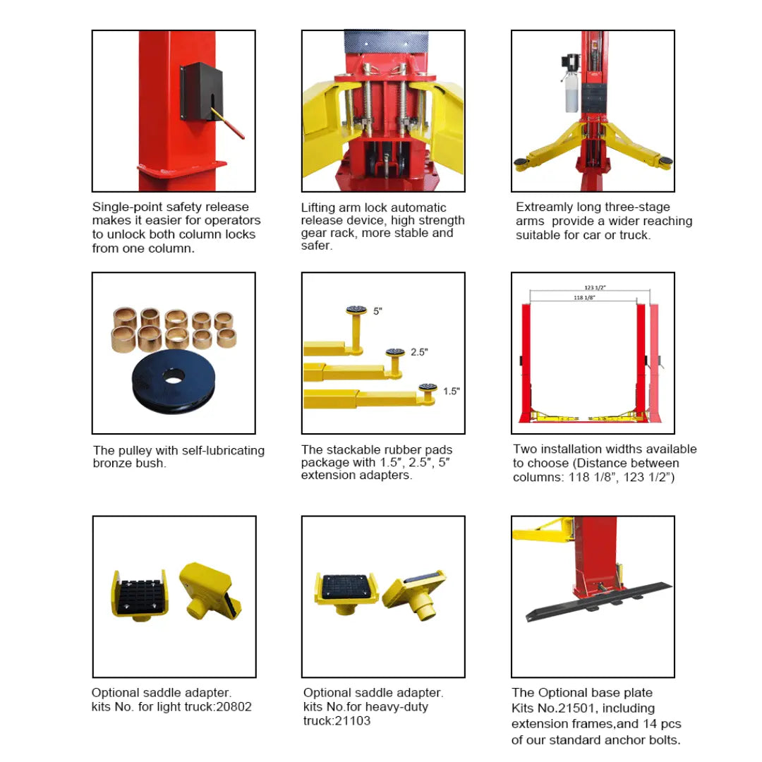 Central to the BP-12's design is its base plate heavy-duty construction, which ensures stability and longevity under rigorous use. The single-point safety release feature enhances operational efficiency by allowing operators to unlock safety locks from both columns simultaneously, complemented by a dual locking system that adds an extra layer of safety during use. The inclusion of four three-stage arms increases the lift's versatility, making it suitable for a broader range of vehicles by accommodating different vehicle widths and wheelbases.