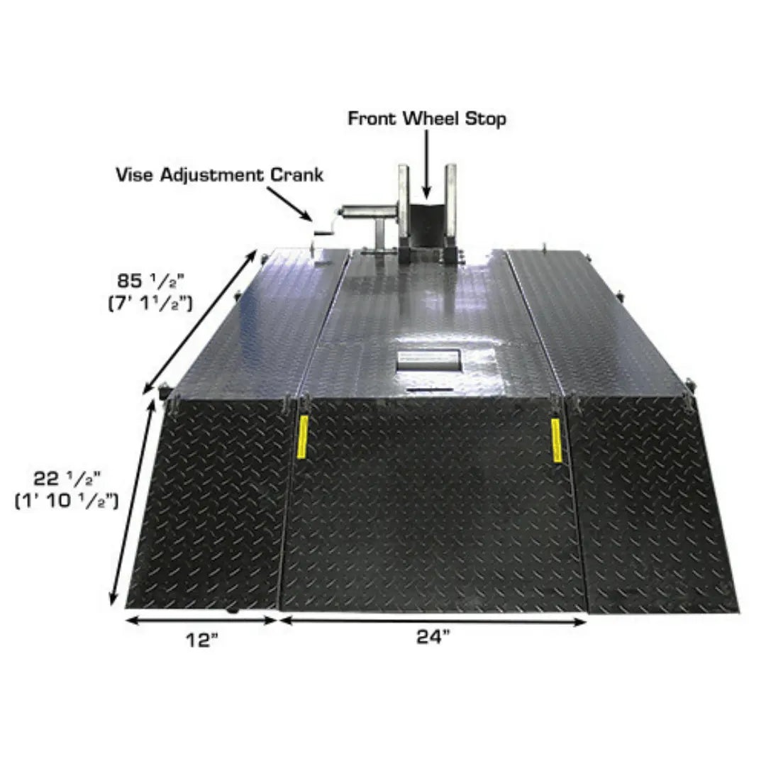 Includes side extension kit (two 12" side extensions and ramp extensions), wheeled dolly, stabilizing bar, padded front wheel vise, removable rear plate with optional dyno-roller, and excellent portability.