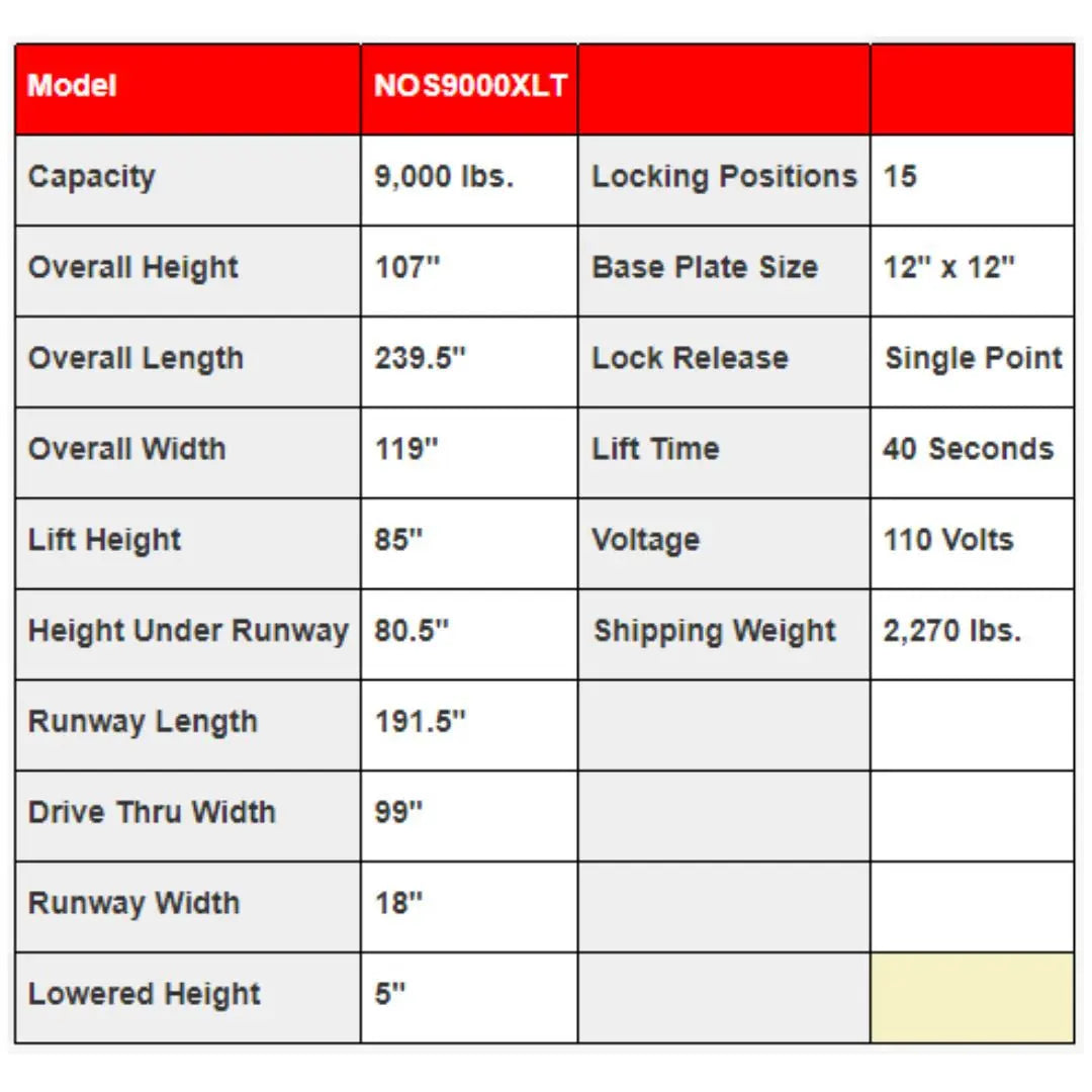 With a 9,000 lb capacity, the NOS-9XLT handles everything from daily drivers to light trucks with ease. The extended runway length and added lift height provide the clearance needed for taller and longer vehicles, making it an ideal choice for maximizing storage in high-ceiling garages.