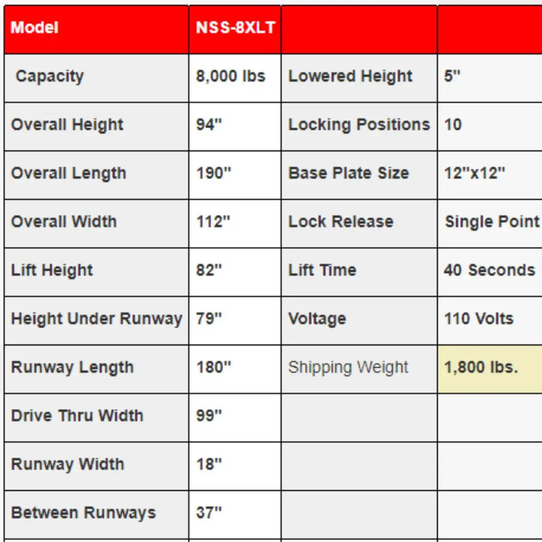 Standing tall with an overall height of 94 inches and an extended overall length of 190 inches, the NSS-8XLT is crafted to provide ample space for vehicle servicing. Its overall width of 112 inches, combined with a generous lift height of 82 inches and a height under the runway of 79 inches, ensures easy access to the underside of vehicles for maintenance, repair, or storage. The lift’s runway length of 180 inches accommodates vehicles of various sizes, while the drive-thru width of 99 inches and runway width of 18 inches add to its versatility.